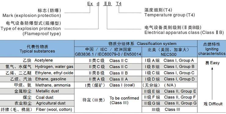 ExdIICT4適用于II類C級(代表性物質:氫氣、乙炔),溫度組別為T4及以下組爆炸性氣體或粉末混合物存在的�(huán)境�
