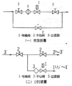 3、在電磁閥發(fā)生故障時(shí),為了及�(shí)隔離電磁閥,并保證系�(tǒng)正常�(yùn)行,最好安裝旁路裝置(如圖一)�