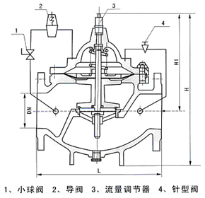 400X流量控制閥由主閥、流量調(diào)節(jié)閥、針閥、導閥、球閥、微形過濾器和壓力表組成水力控制接管系統(tǒng)。利用水力自動操作,控制和調(diào)節(jié)主閥開度,使通過主閥的流量保持不變。